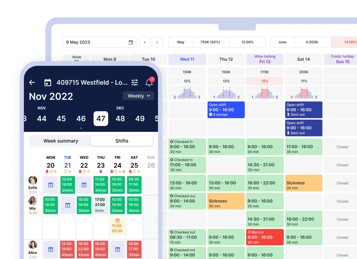 Store managers can schedule easily using assisted AI from the desktop or the mobile app. Employees see the current schedule in the mobile app, preventing misunderstandings about working hours. When the schedule is modified, affected employees are asked to confirm that they have seen the changes.